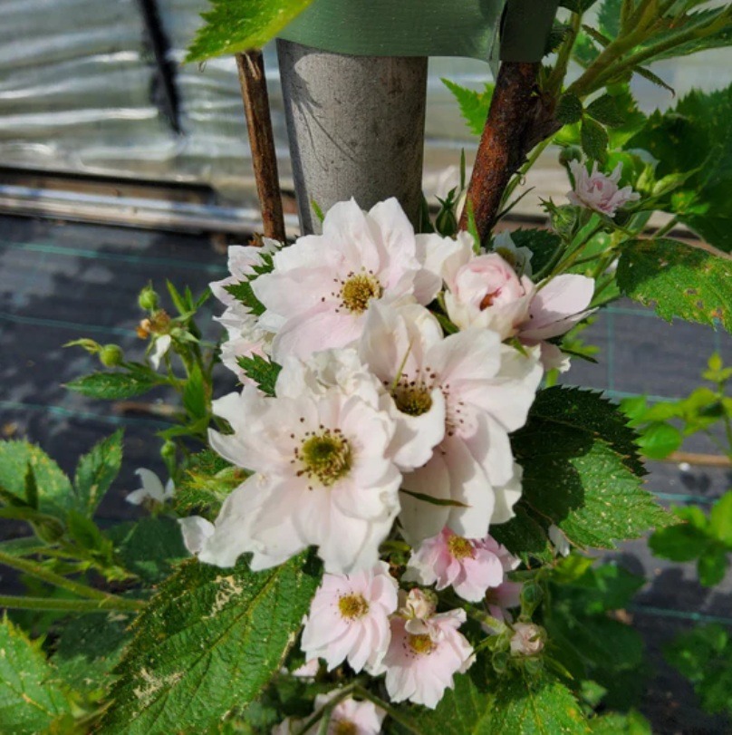 Doornloze braam. Bloeit met mooie dubbele roze bloemen. Vrij vroeg in het seizoen rijp: vanaf half juli t/m eind augustus. Stengels zijn minder sterk en buigen snel neer. Onder de -15°C heeft dit ras vorstbescherming nodig.