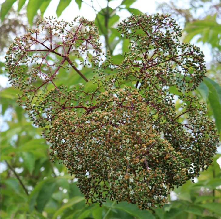 De bloemen ruiken minder sterk van de gewone zwarte vlier, de smaak is milder.